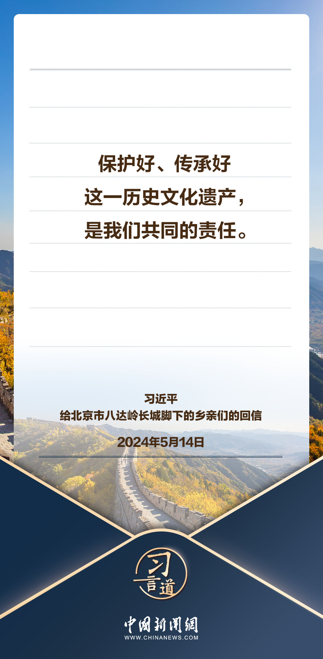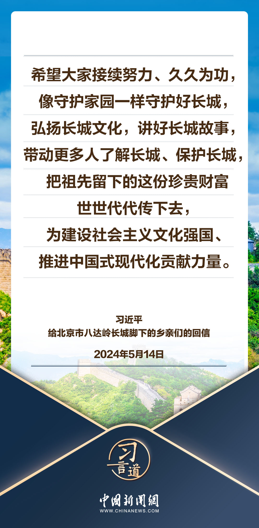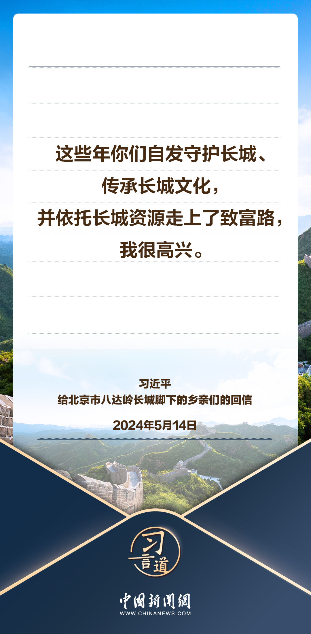 中共中央总书记、国家主席、中央军委主席习近平5月14日给北京市延庆区八达岭镇石峡村的乡亲们回信,向他们致以诚挚问候并提出殷切期望。习近平指出——