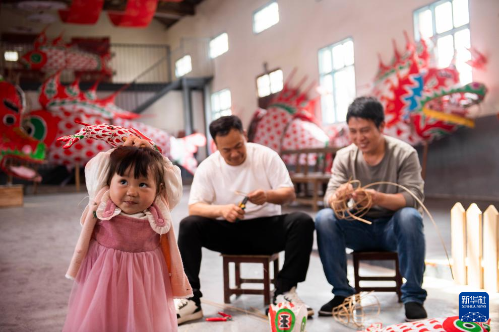 小朋友在溪头镇汪满田村鱼灯工坊内玩耍(5月10日摄)。