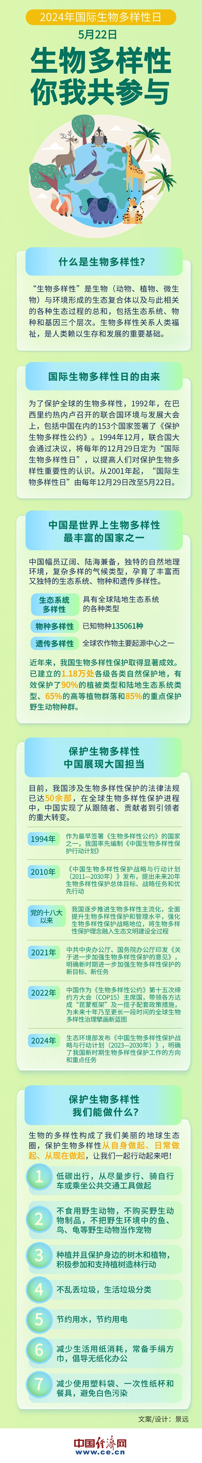 生物多样性,你我共参与。我们每个人都是保护生物多样性的践行者和监督者,要自觉参与到保护生物多样性中来,用实际行动善待动植物,保护生态环境,共建一个人与自然和谐共生的美丽世界。
