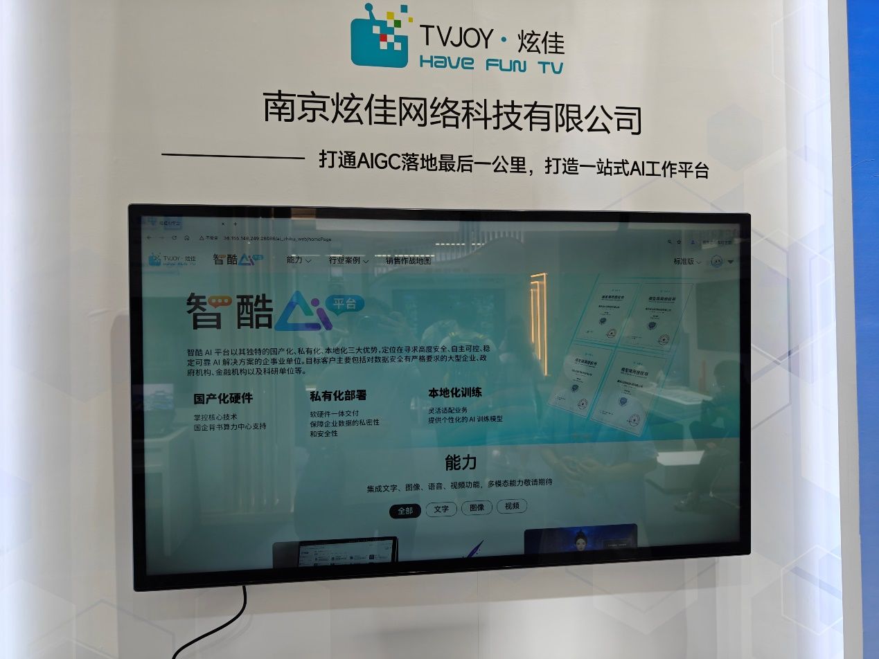 走过2023年的“百模大战”,AIGC在2024年迎来了商业应用大爆发。从产品呈现能力来看,AIGC产品在“读、写”方面最为普及,而“看、画、听、说”等能力也在快速发展之中。在南京展馆,炫佳网络展示了基于大型预训练模型、生成式智能等AI技术服务工具平台——智酷AIGC平台。其通过已有数据的学习和识别,以适当的泛化能力生成相关内容,包括文本生成、文生图、文生音/视频等,可应用于多个行业场景。