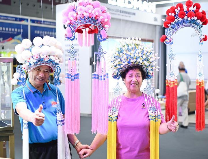 5月23日,参观者在第二十届文博会福建馆体验簪花。新华社记者毛思倩摄