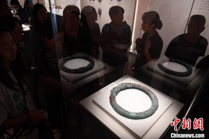 新疆维吾尔自治区博物馆收藏的对兽铜环吸引参观者。张浪 摄