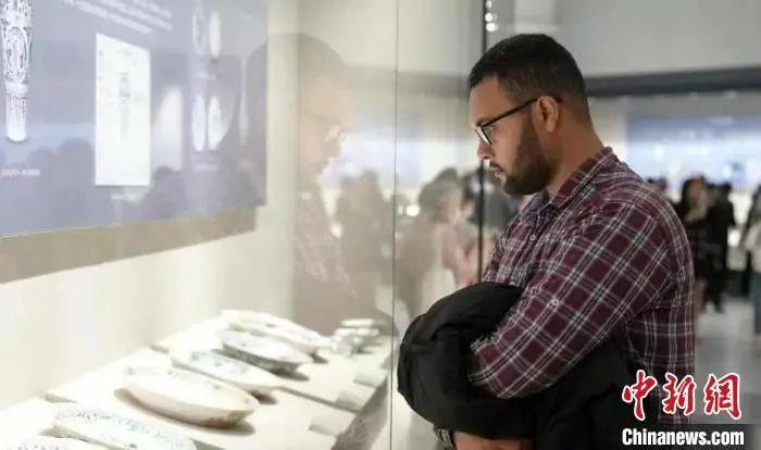 图为埃及在华留学生麦迪正在参观青花瓷。 受访者供图