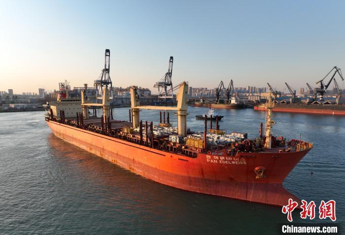 图为2022年12月29日,满载1.16万方设备物资的“雪绒花”轮在山东港口烟台港启航驶向沙特阿拉伯。