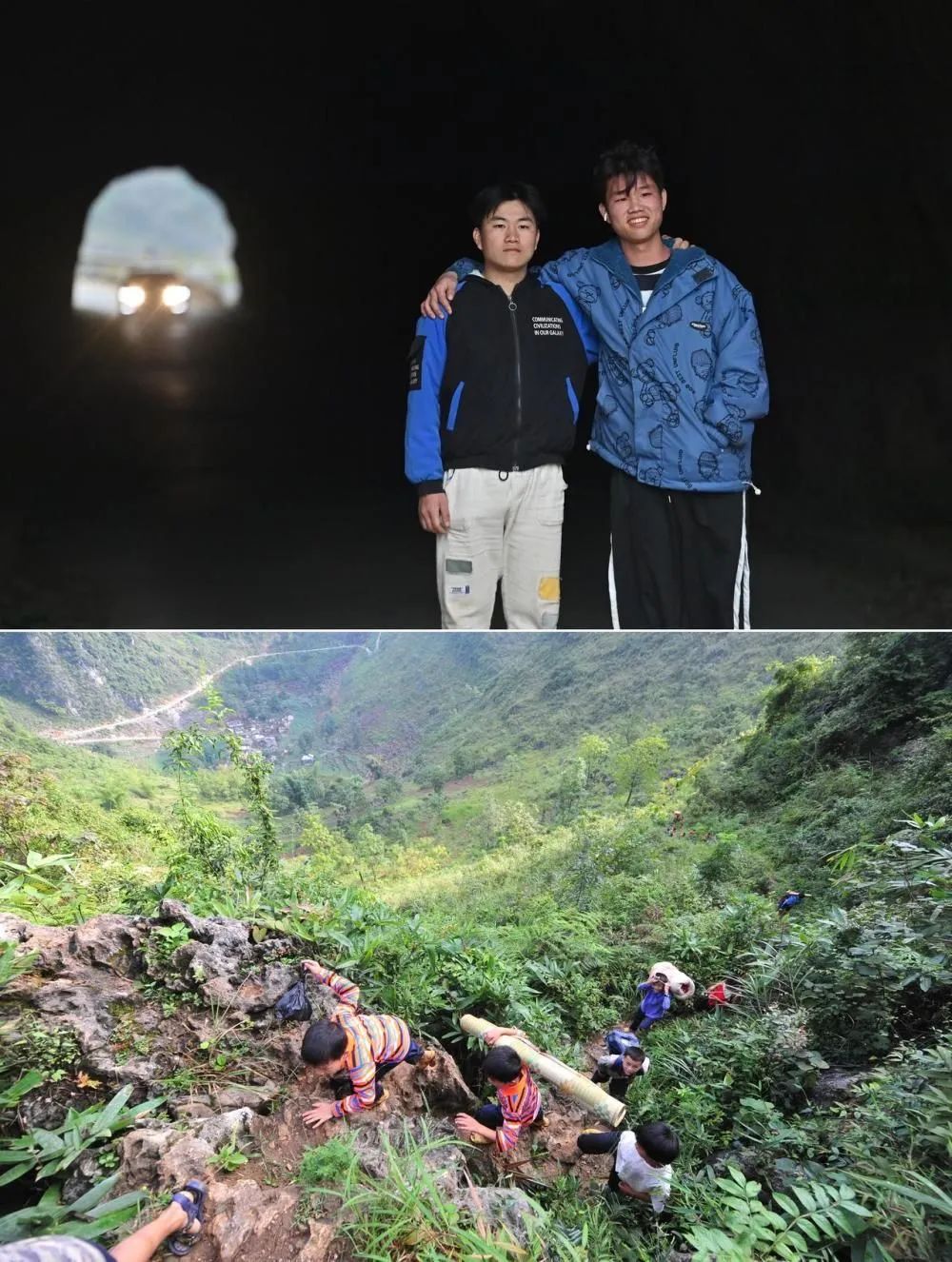 拼版照片:上图为2023年1月20日,在大化瑶族自治县板升乡弄勇村,22岁的蒙宣任(左)和弟弟蒙宣汰站在通往弄勇小学的隧道旁合影,隧道上方是他们儿时上学需要攀爬的“天梯”;下图为2012年9月3日,在大化瑶族自治县板升乡弄勇村,蒙宣汰(左一)、蒙宣任(左二)爬山路去学校。蒙宣任目前在辽宁省交通高等专科学校读书,弟弟蒙宣汰从技校毕业后在广东一家汽修厂上班。组图均由新华社记者 黄孝邦摄