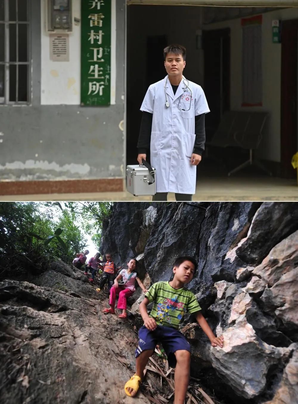 拼版照片:上图为2023年5月24日,村医蒙富松站在大化瑶族自治县板升乡弄雷村卫生所前(新华社记者胡星宇摄);下图为2012年9月5日,10岁的蒙富松(右一)爬悬崖去学校读书(新华社记者黄孝邦摄)。2021年,蒙富松从卫校毕业,回到家乡成为一名村医。