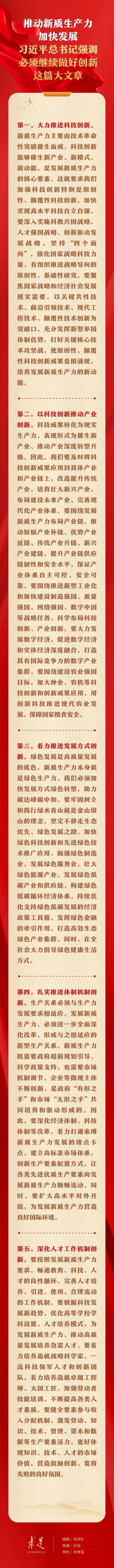 6月1日出版的第11期《求是》杂志刊发习近平总书记重要文章《发展新质生产力是推动高质量发展的内在要求和重要着力点》。在这篇重要文章中,习近平总书记从科技创新、产业创新、发展方式创新、体制机制创新、人才工作机制创新等五个方面,对推动新质生产力加快发展提出明确要求。
