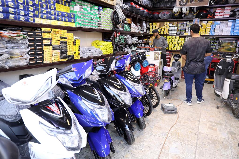 4月16日,顾客在伊拉克首都巴格达的一家中国电动自行车专营店内保养车辆。新华社发(哈利勒·达伍德摄)