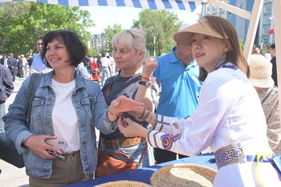 6月4日,黑龙江黑河,中俄民众共同参与端午游园会。图为爱辉区兴安街道工作人员给俄罗斯游客佩戴五彩线。本文图片均由视觉中国提供