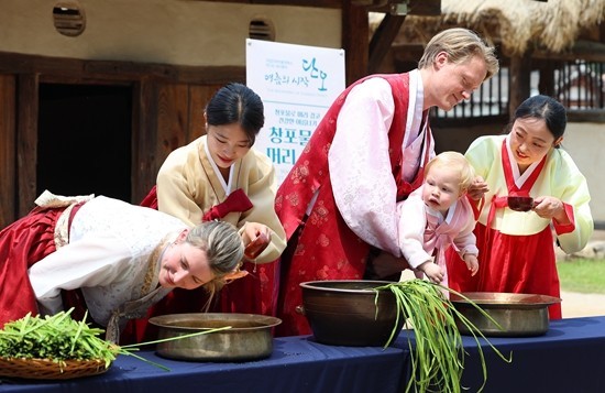 6月5日,韩国首尔,端午节临近,外国留学生正在体验菖蒲水洗头。在天气炎热的端午,自古以来就有用菖蒲水洗头消除邪气,保持健康头发的风俗。