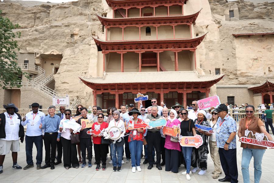 6月6日至8日,来自22个国家的驻华使节和高级别外交官走进敦煌,寻访莫高窟,游览鸣沙山月牙泉景区,参加河西走廊五市的文旅专场推介会,并在对话会上共同探讨“丝路精神推动文明交流互鉴”。