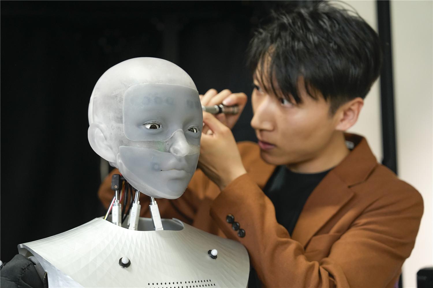 位于合肥市蜀山区“科里科气”科创驿站—科大站的无论科技(安徽)有限公司的技术人员在调试人形情感交互机器人。