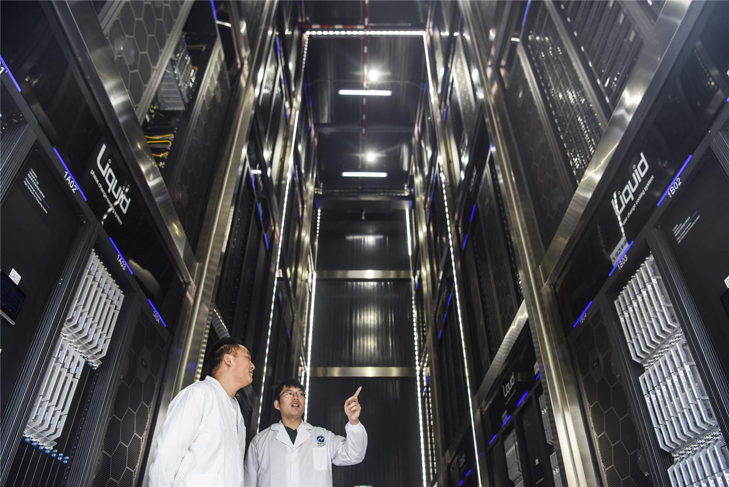 位于合肥高新区的合肥先进计算中心的技术人员在查看“巢湖明月”超级计算机运行状况。
