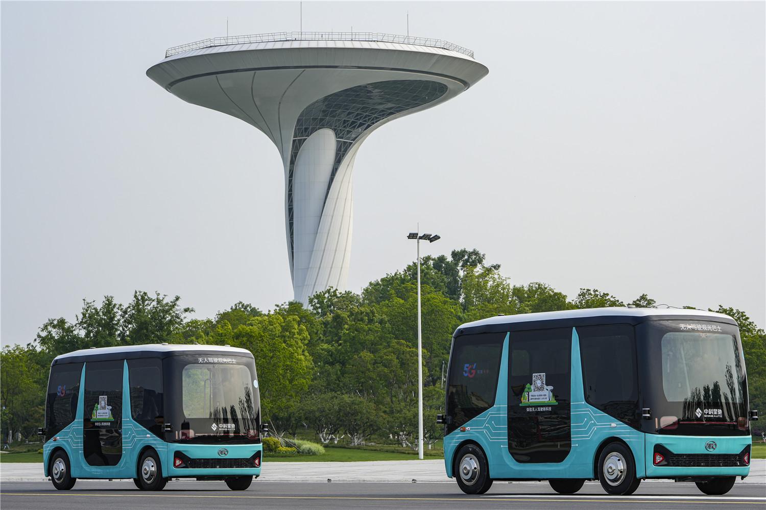 在合肥骆岗中央公园拍摄的安徽中科星驰自动驾驶技术有限公司研发的无人驾驶观光巴士。