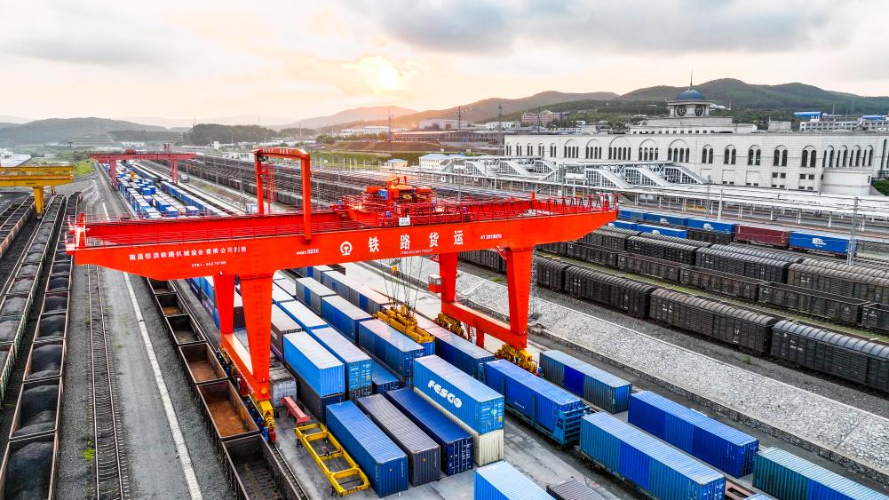 7月12日,入境中欧班列在中国铁路哈尔滨局集团有限公司绥芬河站集装箱换装场进行换装(无人机照片)。新华社发(曲艺伟摄)