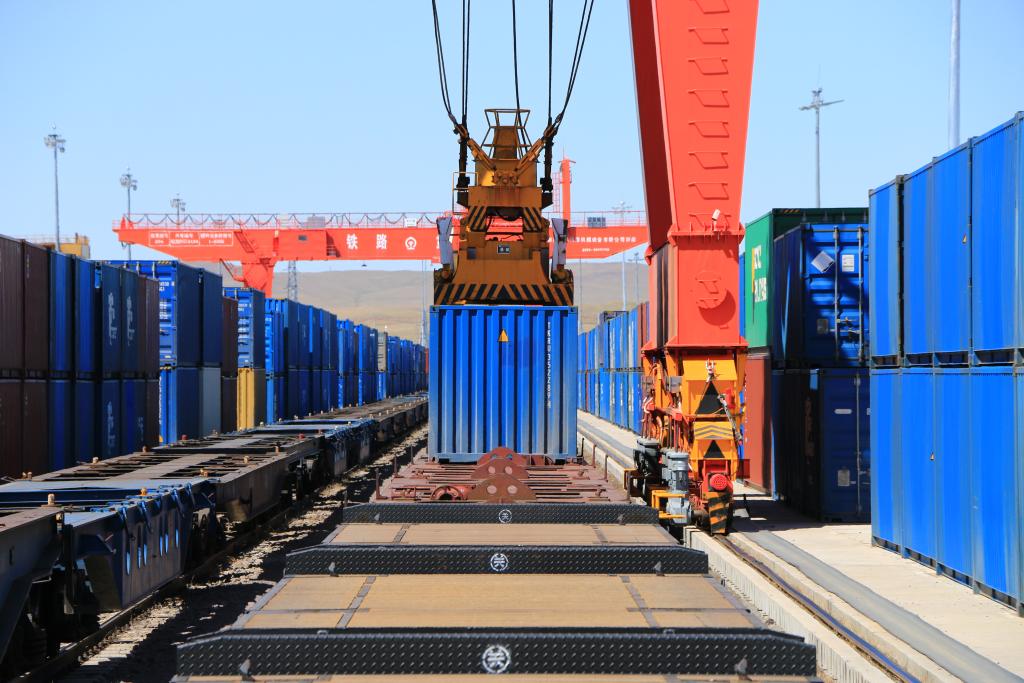 5月15日,中国铁路哈尔滨局集团有限公司满洲里站货运车间集装箱场在对中欧班列进行换装作业。新华社发(黄旭摄)