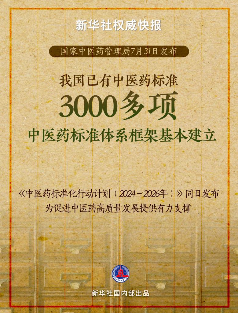 国家中医药局当天发布《中医药标准化行动计划(2024-2026年)》,部署了“加强重点领域中医药标准供给”等6个方面的重点任务,旨在推动标准化战略与中医药事业发展深度融合,提升中医药标准化治理能力,为推进中医药现代化和产业化、促进中医药高质量发展提供有力支撑。根据计划,到2026年底要完成180项中医药国内标准和30项中医药国际标准制定。