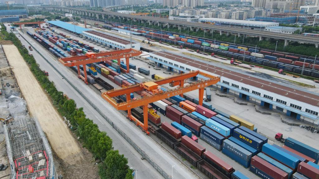 8月1日,一列中欧班列在合肥北站物流基地等待发车(无人机照片)。