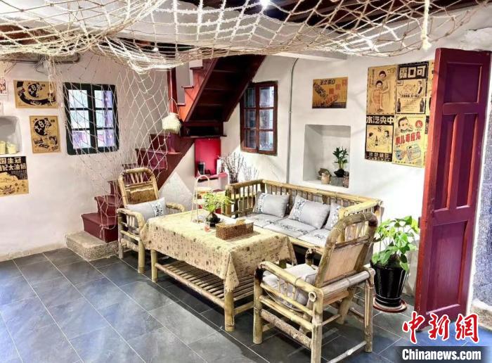 陈柏菁介绍,他特地定做了一套富有渔村“味道”的竹椅,还找了很多以往的旧海报,希望来到这里的人能够进入时光的长廊。