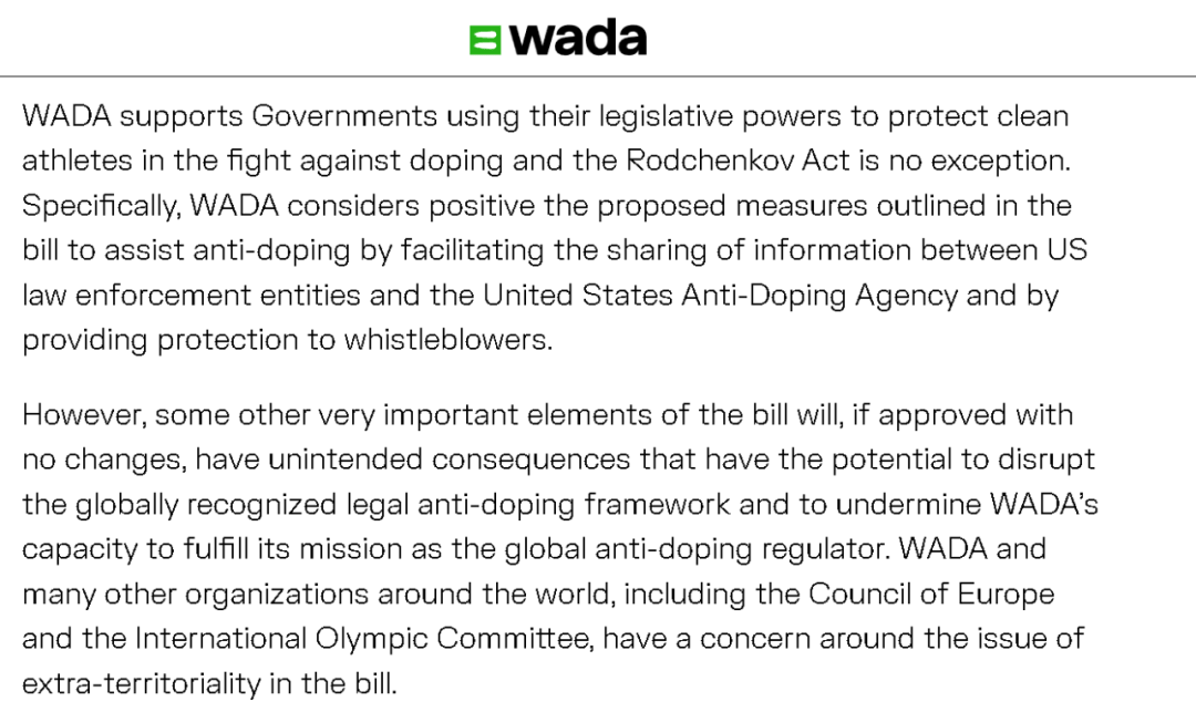 可想而知,当美国最终无视世界反兴奋剂机构的反对,最终通过了这个肆意践踏国际规则以及别国主权的“法案”后,世界反兴奋剂机构会有多么不爽。