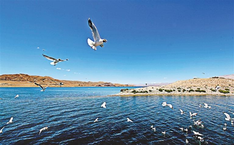 “现在的拉萨河更像一个湖,湖宽水深、涛声阵阵,金色的阳光洒满湖面,一阵风吹来,掀起了不少涟漪。成群结队的候鸟在湖面自由自在地翱翔、嬉戏,让人心旷神怡。”傍晚时分,家住顿珠金融城的拉萨市民平措在拉萨河三号闸上悠闲散步、感慨地说道。