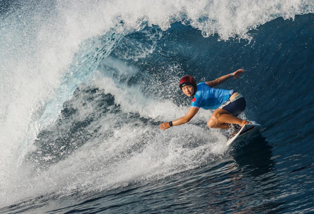 ↑8月1日,中国选手杨思琪在巴黎奥运会女子冲浪项目第三轮比赛中。新华社记者 马平 摄