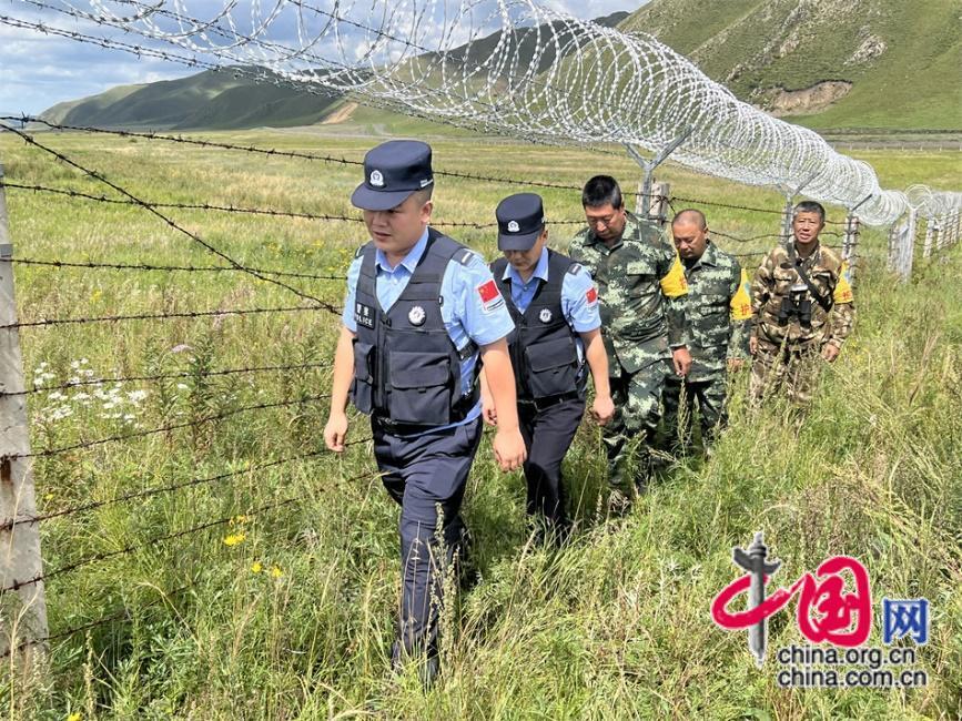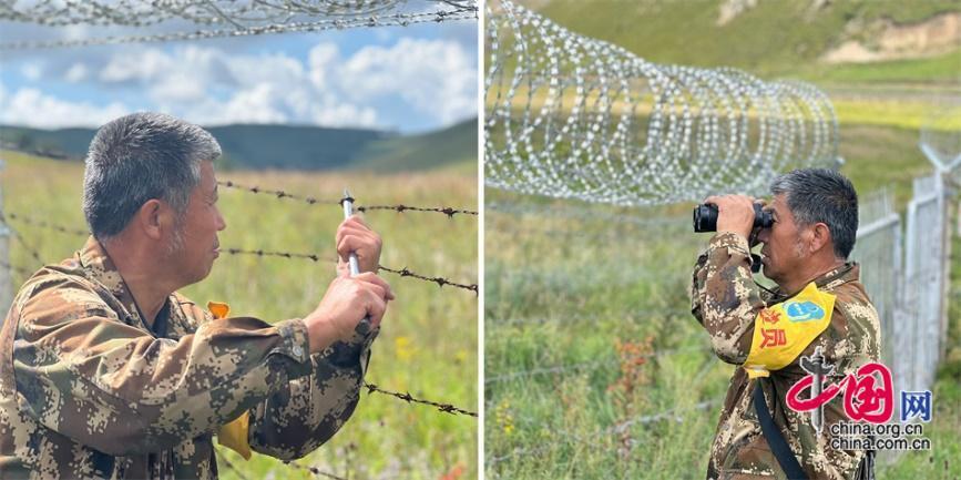 巡边时,王玉发拿着望远镜眺望远方,看到松动的铁丝网,用钳子和锥子加固。中国网记者 吴佳潼 摄