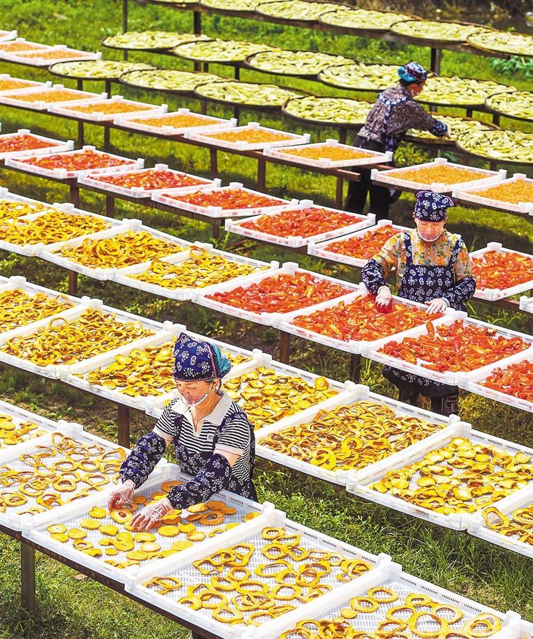 ①8月26日,江西省宜春市铜鼓县温泉镇禄田村,村民在晾晒南瓜、辣椒、苦瓜等农作物。 周 亮摄(中经视觉)