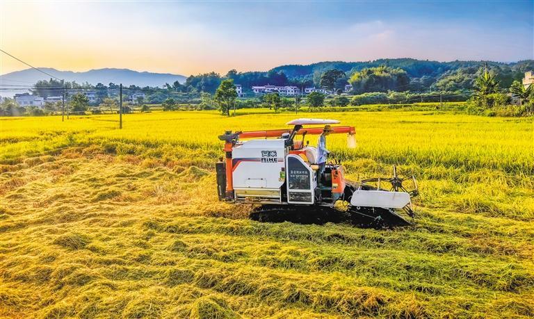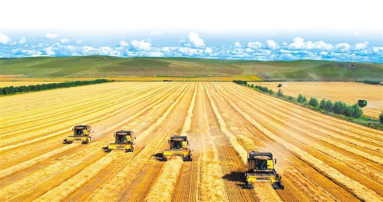 ⑥8月30日,内蒙古自治区呼伦贝尔农垦三河农牧场有限公司高标准农田建设示范田,农机手驾驶联合收割机在田间作业。 谭玉娇摄(中经视觉)