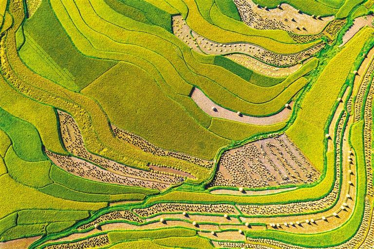⑤9月4日,贵州省黔西市锦星镇洪湖村,村民在收割稻谷。 史开心摄(中经视觉)
