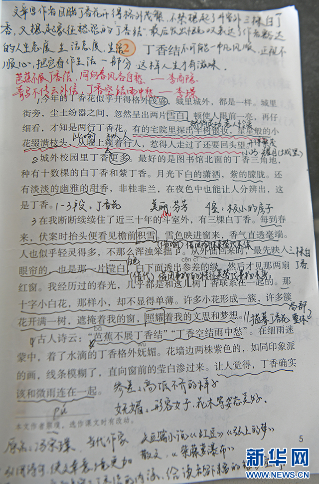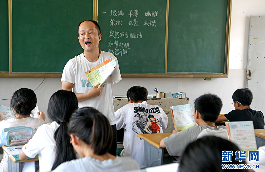 9月5日,安徽省淮南市寿县丰庄镇合庙小学周勇老师在黑板上书写板书,为学生讲解课文《丁香结》。