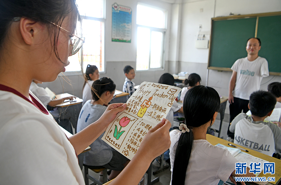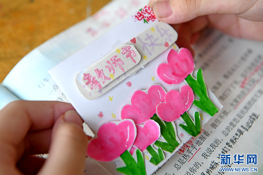 9月5日,合庙小学六年级学生制作贺卡,为周勇送上教师节祝福。