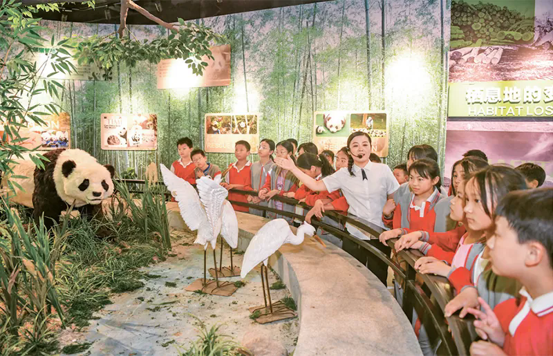 图为2024年5月17日,学生们在江西宜丰熊猫科技馆开展“行走的思政课”主题科普教育活动,增强节约资源和保护自然环境意识。 人民图片 周亮/摄