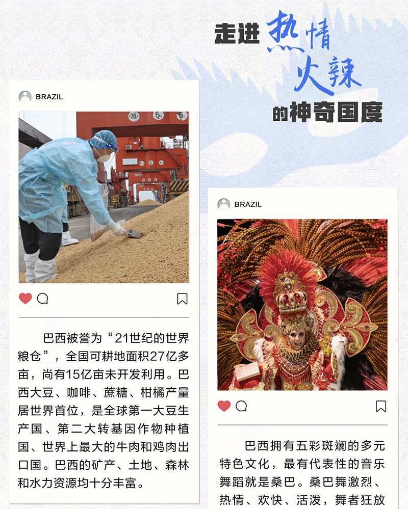 建交半个世纪以来,中巴友谊不断加强,合作日益多元。让我们跟随习主席,一起走进这个因桑巴而美誉全球的南美洲最大国家。