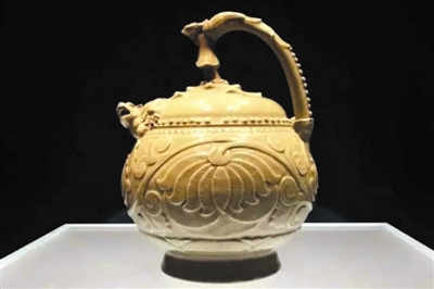 壶身一周饰有凸雕的缠枝牡丹花,下饰一周仰莲瓣装饰,纹饰简洁明快。立体感十足。因为壶身上的狮子是百兽之王,凤凰是百鸟之王,而牡丹则是百花之王,故此壶又被称为“三王壶”。这件倒灌壶,刻花技艺是先用刀具垂直刻出纹样轮廓,再在纹样旁用刀具斜刻,并剔去倒痕中的底泥,使纹样微凸,然后施釉烧制。成品花纹清晰,层次分明,釉色晶莹透亮,有很强的立体效果,实为耀州窑一件罕见的珍品。