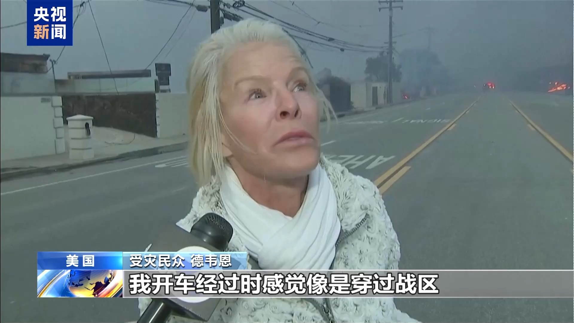 央视记者 刘骁骞:我身后天空弥漫的浓烟就是正在蔓延的帕利塞德山火。和大家来介绍一下最新的采访情况。我们刚刚前往圣塔莫尼卡市采访,刚到没多久,我们的手机上就收到了大量洛杉矶县政府发出的强制撤离的短信,要求所有居民必须立刻撤离,因为山火正在向居民区蔓延。在一个街角,我们看见警察拉起了一层又一层的警戒线,因为地势比较高的居民区已经有火势,我看见很多居民想要回家取东西,但是都被阻拦了。