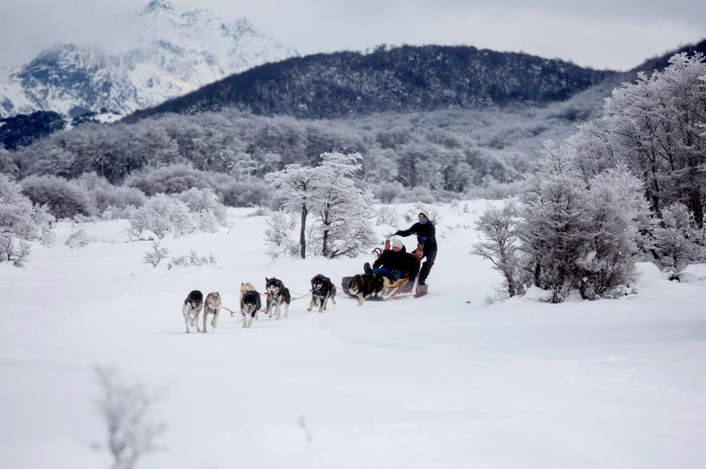 2018年7月8日,在阿根廷火地岛首府乌斯怀亚,游客体验狗拉雪橇。在南美大陆最南端的乌斯怀亚距南极洲只有800公里。新华社发(马丁·萨巴拉摄)