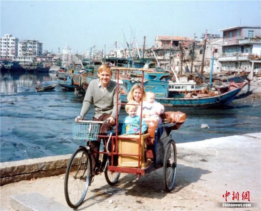 1988年,潘维廉骑着三轮车带着家人走遍厦门的大街小巷。受访者供图