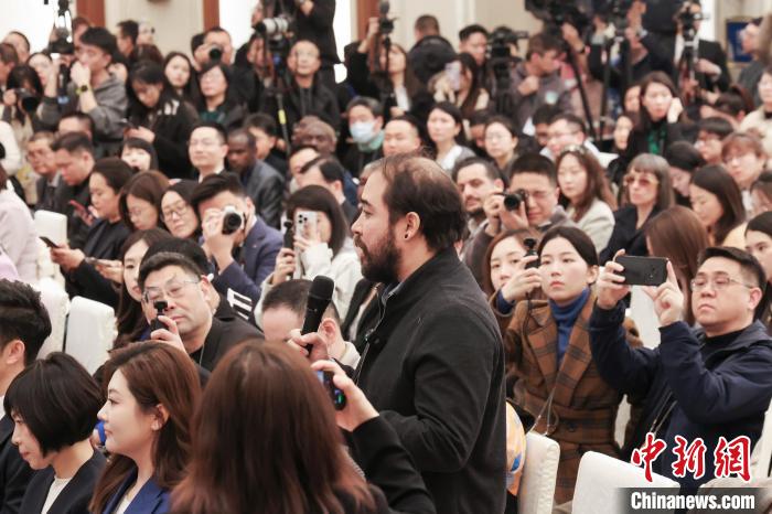 3月3日,全国政协十四届三次会议新闻发布会在北京人民大会堂举行。图为巴西劳动者电视台记者提问。 中新社记者 杨可佳 摄
