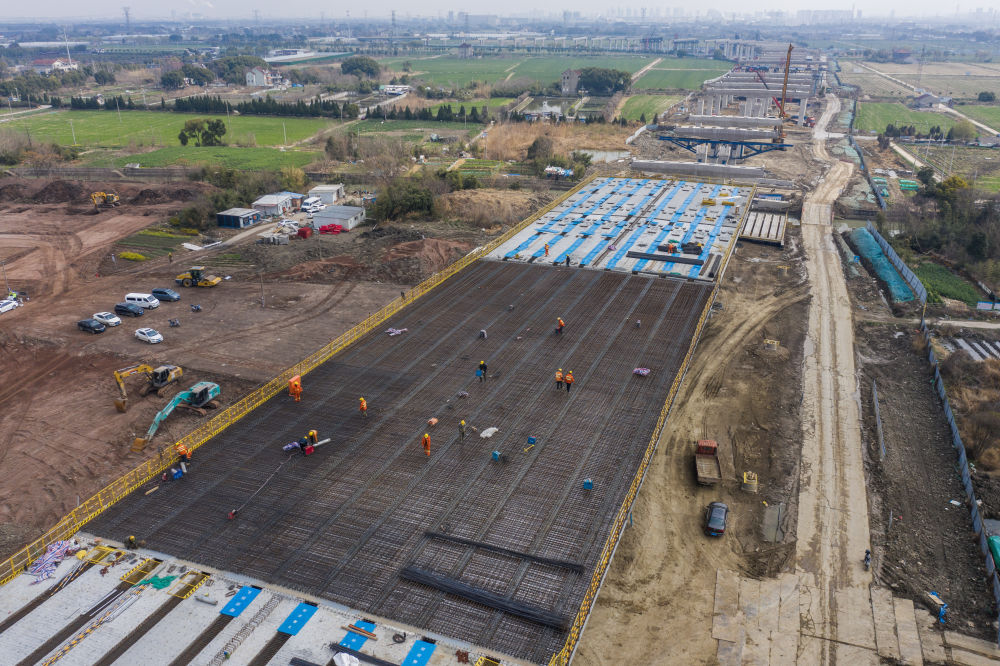 3月7日,在524国道秀洲王江泾至新塍公路工程TJ02标段,作业人员正在进行60米钢混组合梁现浇桥面板钢筋焊接及绑扎作业(无人机照片)。新华社记者 徐昱 摄