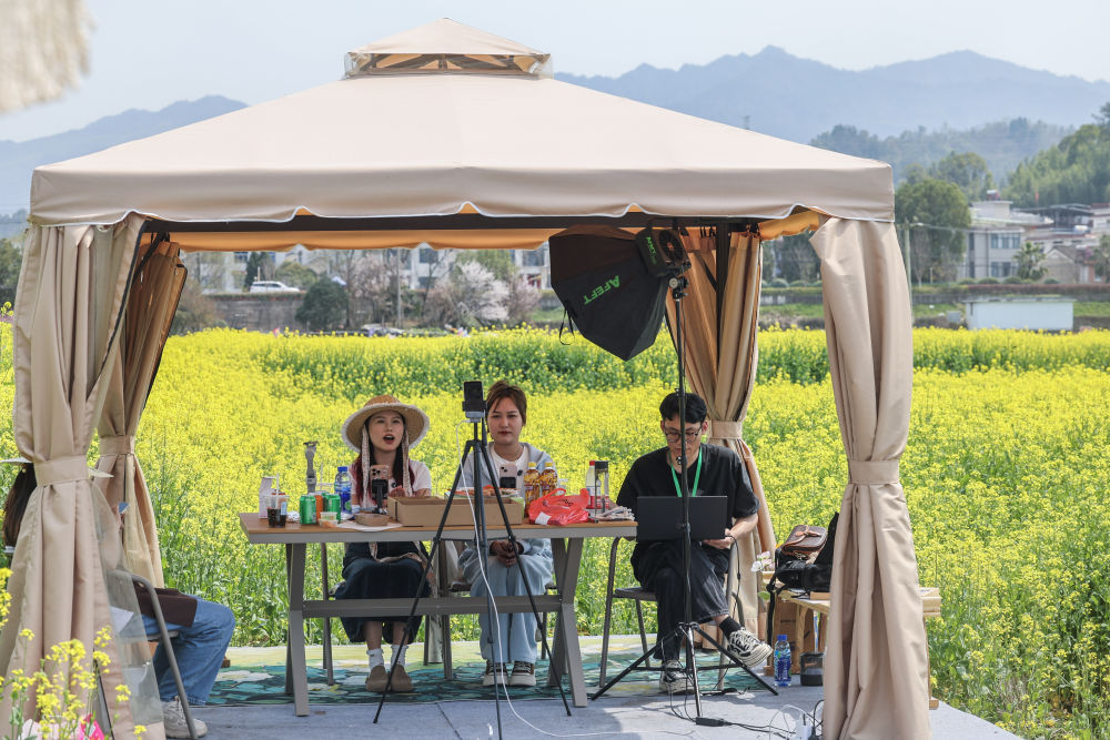 3月23日,主播在浙江建德更楼街道城南城市田园油菜花田边的直播间内推介当地文旅项目。新华社记者 徐昱 摄