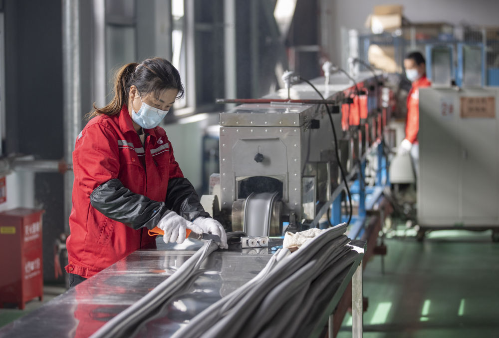 3月27日,在位于宁夏贺兰工业园区的汤姆森电气有限公司生产车间内,工作人员制作硅胶绝缘护套。新华社记者 杨植森 摄