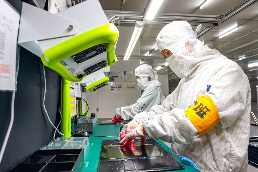3月21日,在江苏省江都高新技术产业开发区江苏和熠光显科技有限公司,工人在无尘车间作业。新华社发(任飞摄)