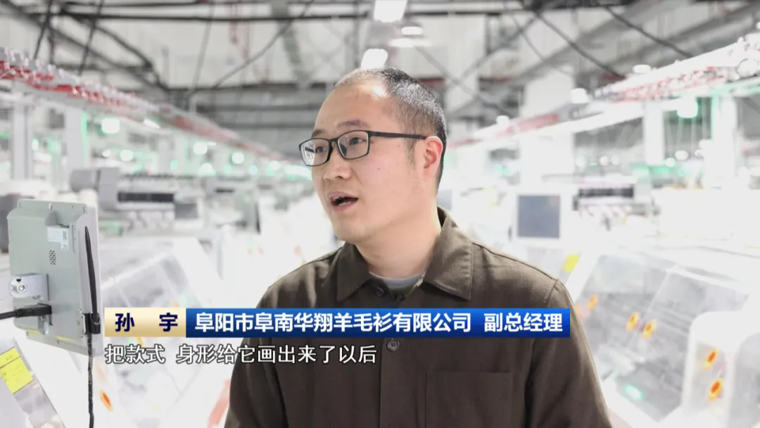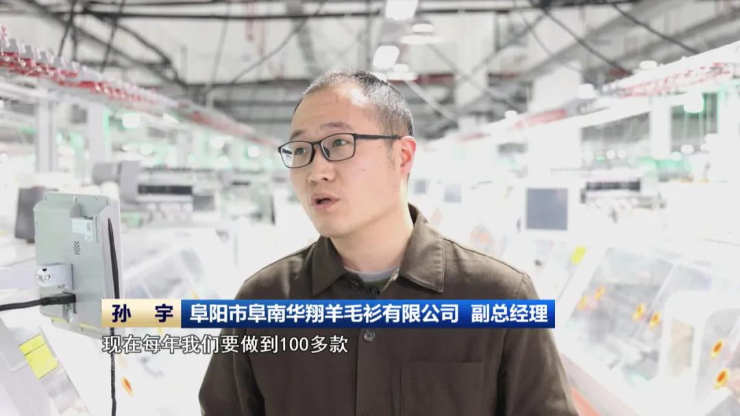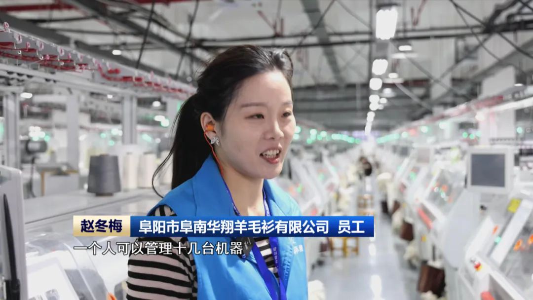 这里是阜南县华翔羊毛衫公司的生产车间。我身旁的这些设备就是行业内最先进的羊毛衫自动纺织生产线,相比于以前的装备,现在工人们只需要完成纱线更换等简单的操作,剩余的步骤就可以全部交给机器来完成。
