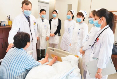海口市人民医院内,慕名而来的患者正好奇地打量着眼前的“洋医生”。