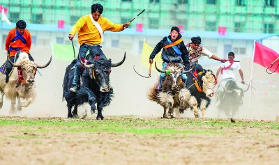 西藏拉萨市达孜区,农牧民群众在参加赛牦牛比赛。新华社发