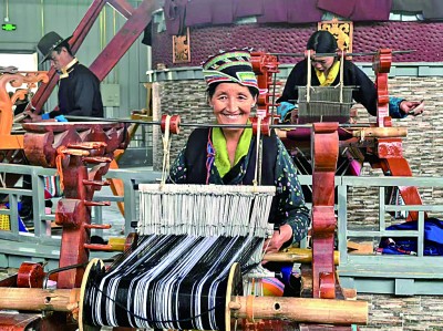 西藏山南市乃东民族哗叽手工编织专业合作社内,村民们正在编织纯手工的泽帖尔。本报记者李丹阳摄/光明图片