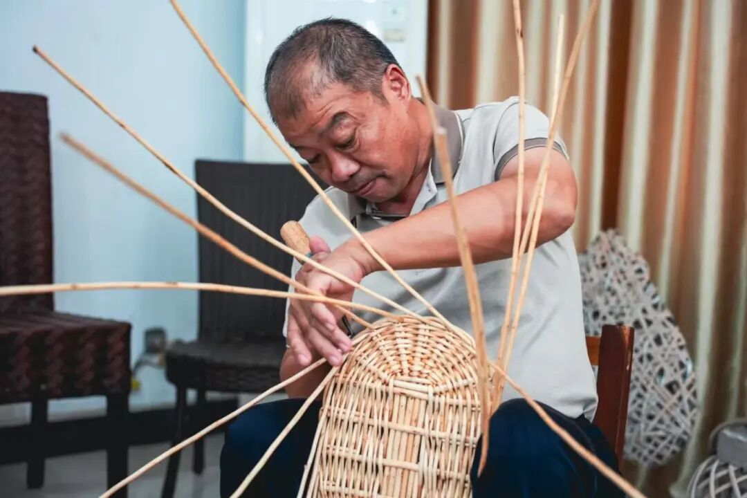 "现在的柳编不再是传统的筐筐篮篮,样品就有2000多个种类。""霍邱柳编"市级非遗传承人沈家明一边熟练地编织着一个现代风格的花篮,一边介绍道。在他手中,柔软的柳条仿佛被赋予了生命,不一会儿就呈现出精美的造型。