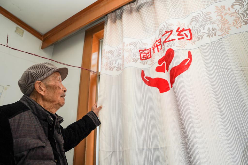 这是合肥市瑶海区恒通社区居民薛怀敬家中的爱心窗帘。新华社记者杜宇 摄