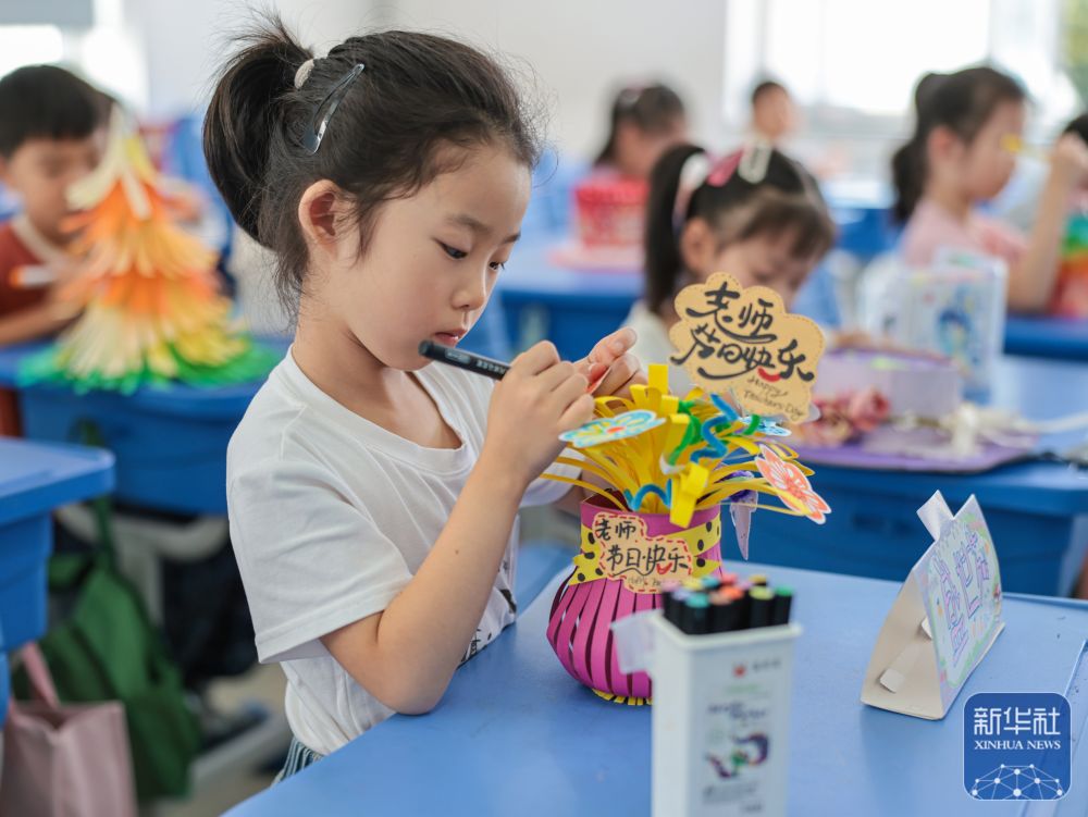 9月9日,山东省临沂市郯城县郯城街道官塘幼儿园的孩子将在老师的指导帮助下制作的绘画送给老师。新华社发(张春雷摄)
